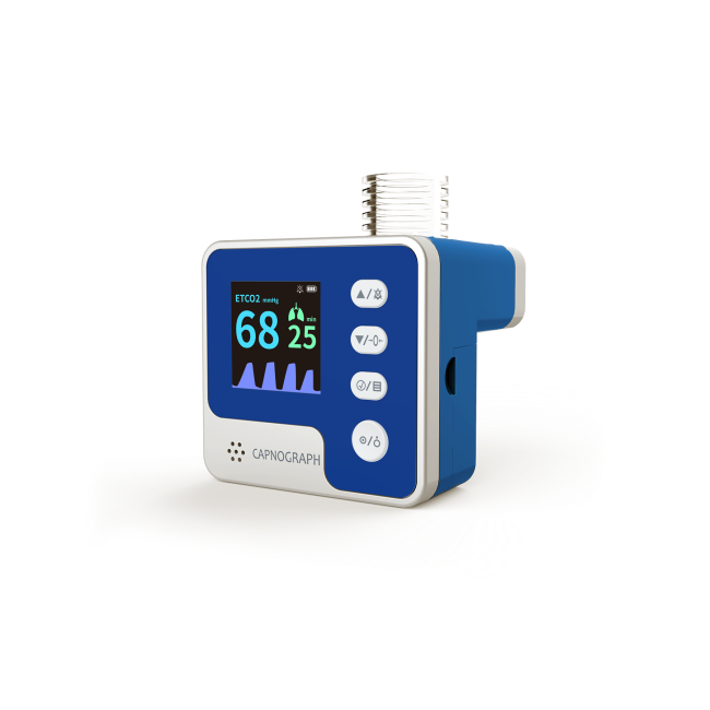 A Capnograph adopts mainstream methods to measure the end-tidal carbon dioxide, airway respiration rate and other parameters. It can detect pulmonary ventilation function and reflect the circulation and pulmonary blood flow condition, as well as indirectly reflect the alveolar ventilation, which is applicable for use in pre-hospital emergency transfer, emergency department, ICU, operating room, neonatology, respiratory department and other occasions. The application population is adult, paediatric and neonate patients. The Capnograph connects with patient’ respiratory tract by the airway adapter and breathing tube.